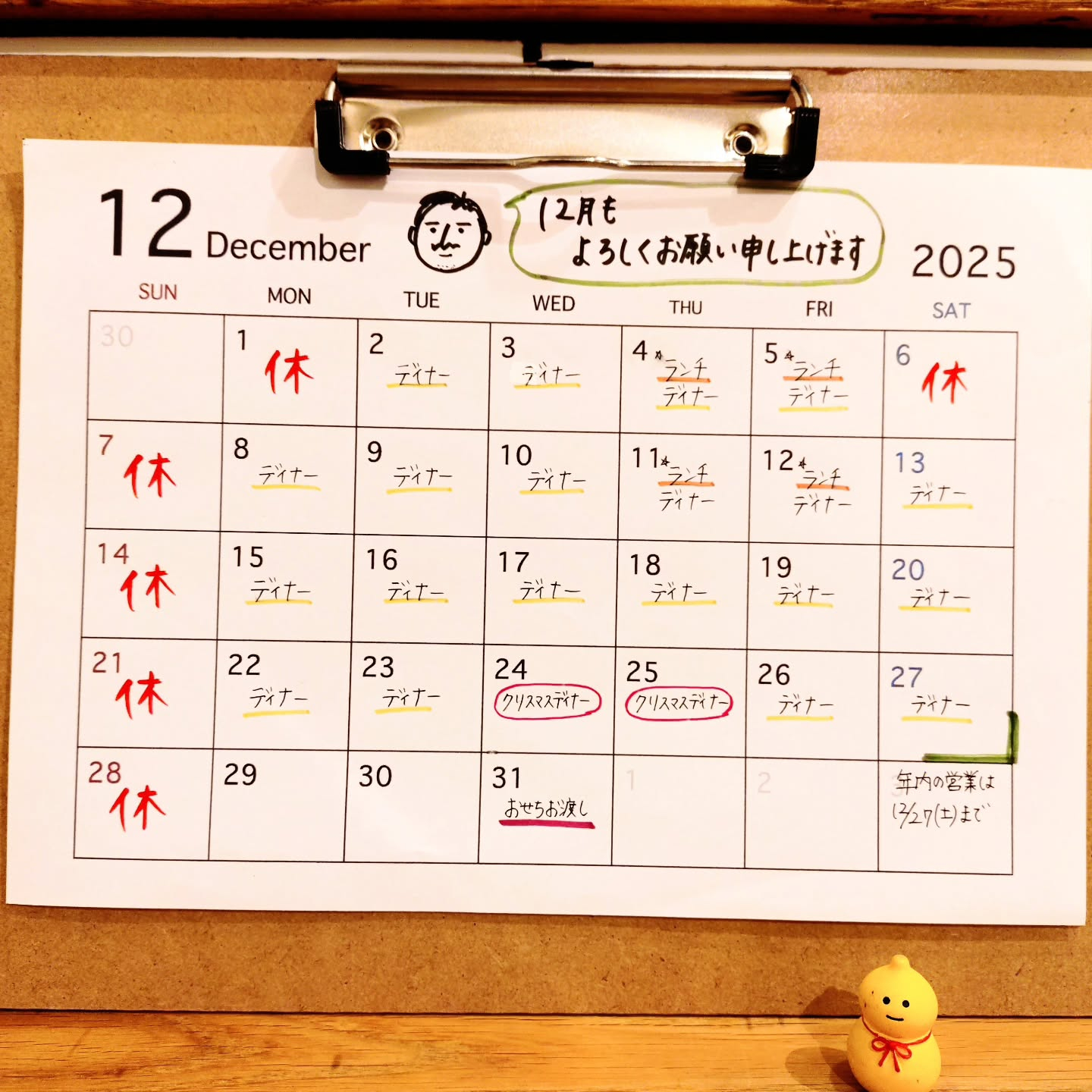 《12月の営業カレンダーです》 12月も宜しくお願い申し上げます。 ランチが少なかったり、曜日によっては早めに埋まったりしますがお気軽にご相談くださいませ。 24日と25日はクリスマスディナーです。 近日中にアップします […] 《28日㈮と29日㈯ 席あり〼》 今週の金、土曜日はまだ席がこざいます。 皆さま是非! 写真1 宮嶋林檎園のシナノゴールドとロックフォールのグラタン。 栗のハチミツがアクセントの甘じょっぱいおつまみです。 写真2 宮嶋林 […] ⛄《ベラベッカ2025》⛄ 今年もベラベッカを販売します。 『洋梨のパン』と言う名のアルザスのクリスマスのお菓子です。 昨日UPしたシュトレンと同様にレーズン以外のフルーツは自家加工しております。 一年かけて各地から取り […]